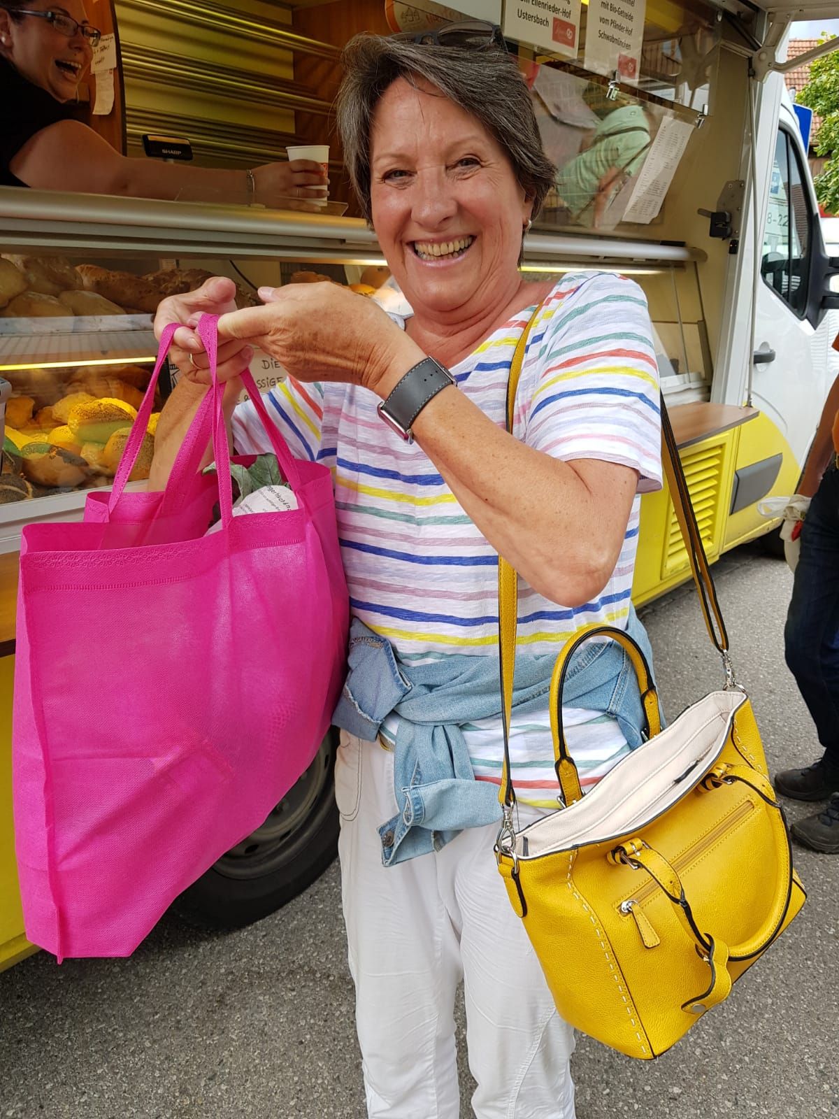 Außerdem konnte die Gewinnerin des 1. Preises unseres Marktfest-Gewinnspiels, Christa Clavey, ihren Preis einlösen: Sie füllte eine Einkaufstasche mit den leckeren Produkten des Hechendorfer Wochenmarktes.